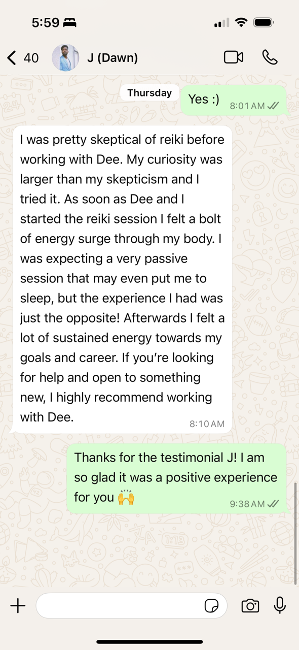 Each person's experience during a Reiki session is unique. Some may feel gentle sensations in their body, such as warmth or tingling, while others may become so relaxed that they drift off to sleep. No matter how you experience it, Reiki is always working as it’s meant to.